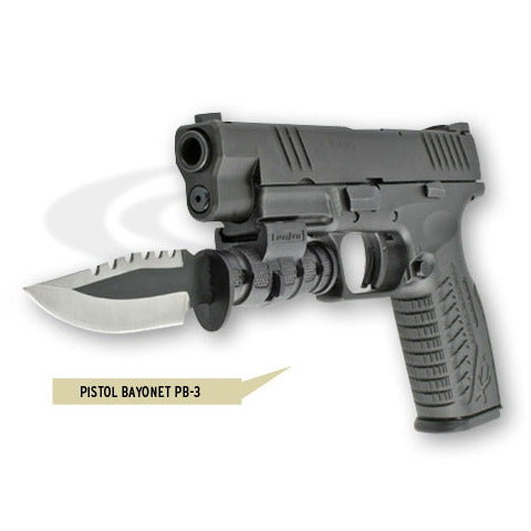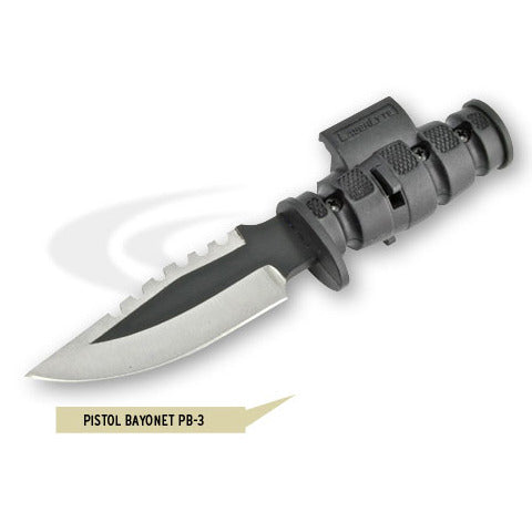 PB-3 This aggressive looking “Mini Survival Knife” design is now available for your pistol. It is the 3rd generation of the extremely popular line of LaserLyte®/Ka-bar® brand pistol bayonets. The exaggerated top serrated blade and two-tone design will look great on any semi-auto pistol. The PB-3 “Mini Survival Knife” is ready for any situation—or just looking cool on your favorite gun.